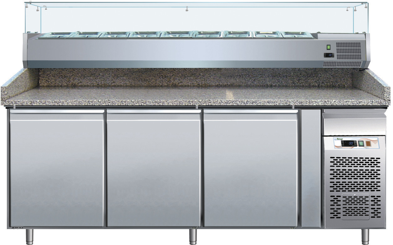 Banco pizza refrigerato – ventilato. Banco pizza refrigertao con refrigerazione ventilata – struttura in acciaio inox AISI 304 e top in granito- gruppo incorporato estraibile per facile manutenzione – andamento circolare dell’aria fredda in modo da non investire direttamente il prodotto – controllo temperatura elettronico con termostato digitale – resistenza elettrica intorno alla cornice porta per eliminazione della condensa – sbrinamento automatico con resistenza elettrica e controllo automatico della temperatura di sbrinamento – evaporazione automatica dell’acqua di condensa – evaporatore trattato anticorrosione. Porta con molla di ritorno – guarnizione porta estraibile senza utensili – fondo con angoli arrotondati – piedini in acciaio Inox AISI 304 regolabili in altezza – schienale in acciaio inox – possibilità di appoggio al muro.