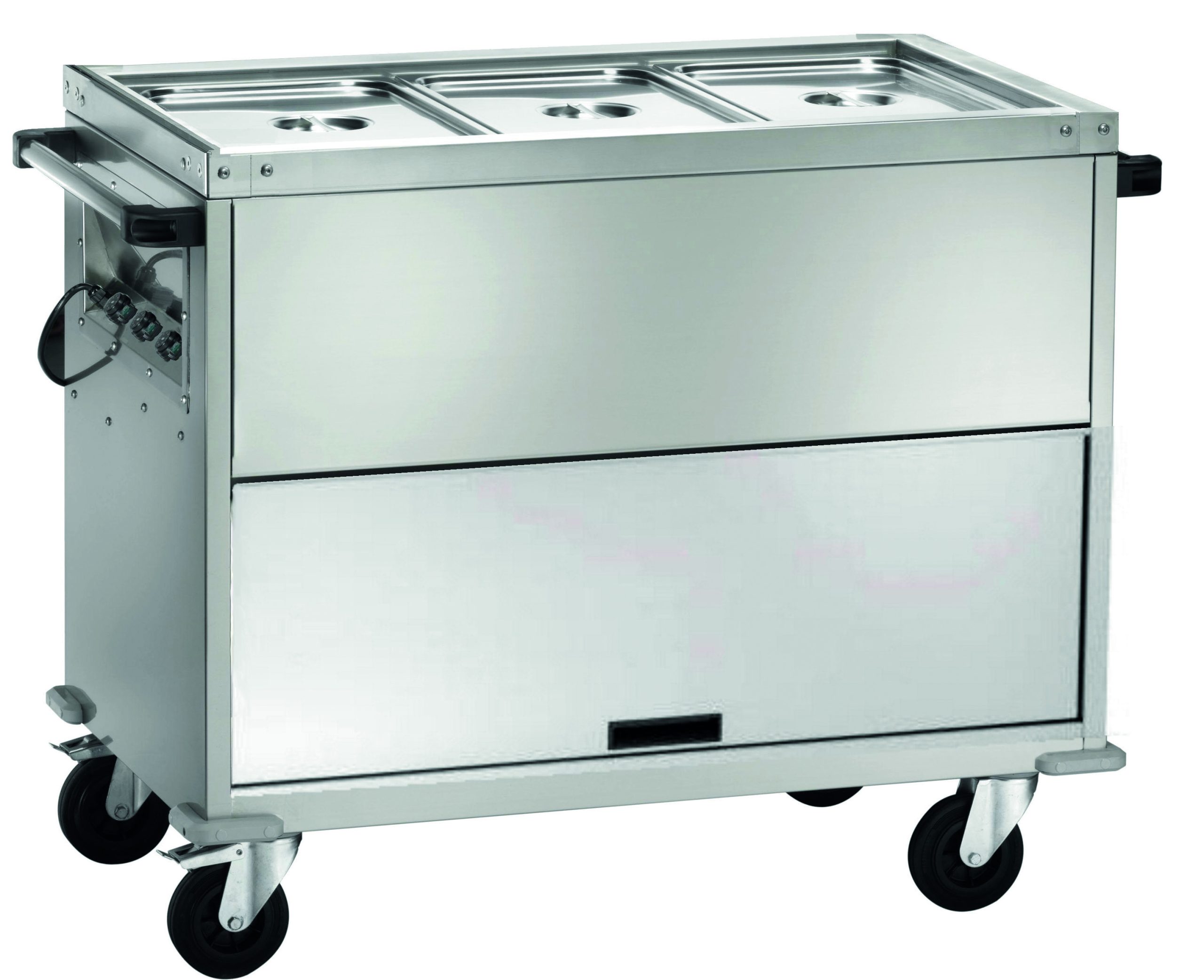 Carrelli termici a bagnomaria armadiati con temperatura differenziata. Struttura in acciaio inox AISI 304 – vano superiore in doppia parete coibentata – provvisti di rubinetto di scarico posto sul fondo – 2 ruote fisse e 2 multidirezionali ø 140 mm. Bacinelle escluse.