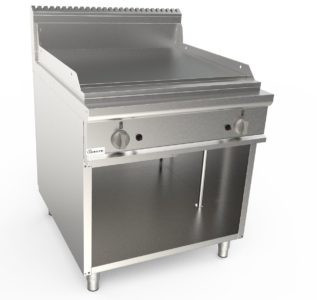 Struttura interamente realizzata in acciaio inox AISI 304 scotch brite. Piano superiore arrotondato in acciaio inox AISI 304 con camino scarico fumi incorporato. Piastra di cottura in acciaio dolce levigato, spessore 15,0 mm, liscia. Alzatine paraspruzzi in acciaio inox AISI 304. Canalina frontale con foro di scarico e GN 1/3 65h mm posizionato nel vano per raccolta olio e grassi. Bruciatori gas a due tubi fiamma ad alto rendimento: nr. 2 zone cottura. Rubinetto valvolato, termocoppia e accensione piezo elettrica, con regolazione temperatura max-min. Manopole e maniglie in materiale atermico. Piedini in acciaio inox AISI 304 regolabili in altezza.