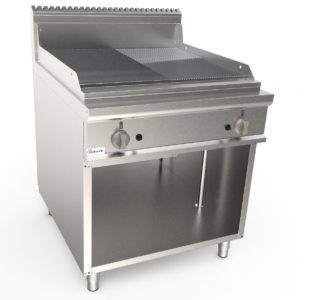 Struttura interamente realizzata in acciaio inox AISI 304 scotch brite. Piano superiore arrotondato in acciaio inox AISI 304 con camino scarico fumi incorporato. Piastra di cottura al cromo duro lucido spessore 15 mm, 1/2 liscia e 1/2 rigata. Alzatine paraspruzzi in acciaio inox AISI 304. Canalina frontale con foro di scarico e GN 1/3 posizionata nel vano inferiore per la raccolta olio e grassi. Bruciatori gas a due tubi fiamma ad alto rendimento: nr. 2 zone indipendenti. Termostato di sicurezza, regolazione 0-8 posizioni, termocoppia e accensione piezo elettrica. Manopole e maniglie in materiale atermico. Piedini in acciaio inox AISI 304 regolabili in altezza.