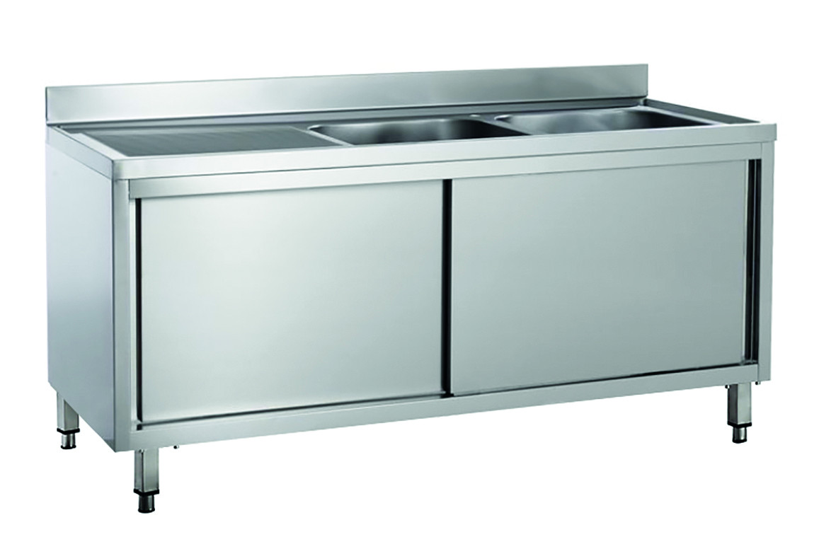 Lavello amadiato - 2 vasche - con sgocciolatoio - porte scorrevoli - profondità 700 mm.Struttura in acciaio Inox - piano e vasca in acciaio inox AISI 304 - Ripiano inferiore con rinforzo ad Omega - porte scorrevoli tamburate - alzatina h 100 mm - piedini