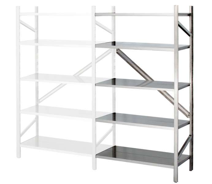 Realizzati completamente in acciaio inox AISI 304 – Le fiancate sono profili presso piegati con passo asolatura di mm. 86 e dotate di gommino inferiore e tappo superiore – I piani sono costituiti da 2 elementi di 250 – Il sistema di montaggio dei traversini e dei piani è ad incastro – La traversa di irrigidimento posteriore e quelle laterali sono bloccate con viti DIMENSIONI mm. 1180x500x1988h