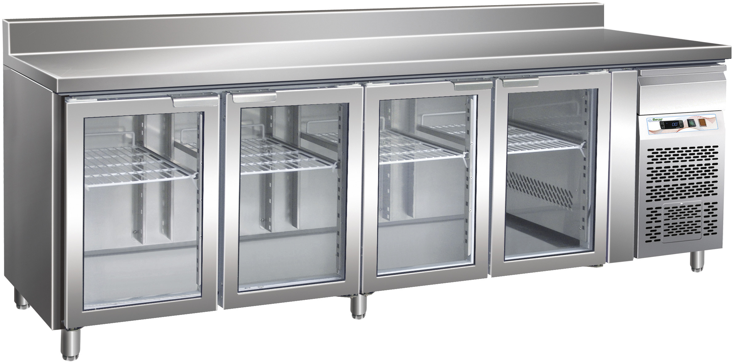 Tavolo refrigerato gastronomia – GN1/1 – ventilato con porte in vetro e alzatina. Tavolo refrigerato gastronomia GN1/1 in acciaio inox AISI 304 – refrigerazione ventilata -gruppo incorporato estraibile per facile manutenzione – andamento circolare dell’aria fredda in modo da non toccare direttamente il prodotto – controllo temperatura elettronica con termostato digitale – resistenza elettrica intorno alla cornice porta per eliminazione della condensa – sbrinamento automatico con resistenza elettrica e controllo automatico della temperatura di sbrinamento – evaporazione automatica dell’acqua di condensa – evaporatore trattato anticorrosione. Porta con molla di ritorno – guarnizione porta estraibile senza utensili – fondo con angoli arrotondati – facile intercambiabilità porte con cassettiere da due e tre cassetti – cassettiere facilmente estraibili con guide telescopiche in acciaio inox. Piedini in acciaio Inox AISI 304 regolabili in altezza – schienale in acciaio inox – possibilità di appoggio al muro. Kit optional di coppia guide per griglie, griglie plastificate, cassetti e kit ruote.